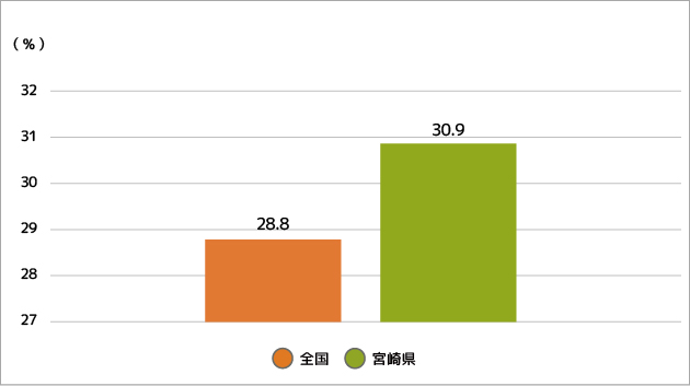 40歳から74歳の特定健診におけるメタボリックシンドローム(内臓脂肪症候群)の該当者とその予備群の割合は、宮崎県は全国平均よりも高くなっています。