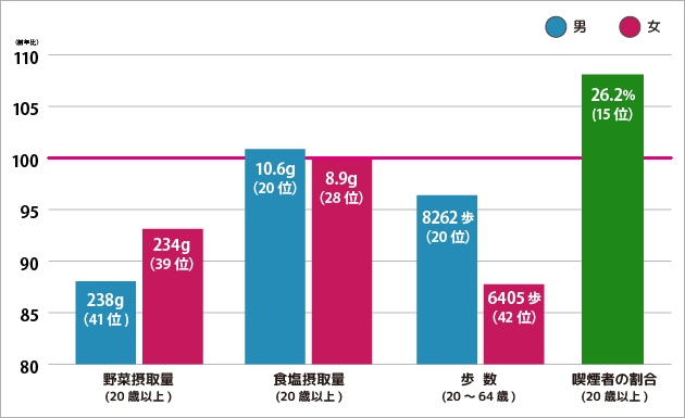 生活習慣病の原因となる行動の全国比 ※全国 100