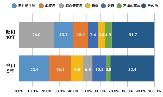 50年前と比較すると、がんの割合が大きくなり、脳血管疾患の割合が小さくなっています。