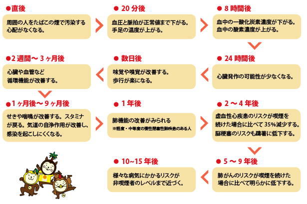 長年たばこを吸っていても、禁煙するのに遅すぎることはありません。また、禁煙は、病気の有無を問わず健康改善効果が期待できるので、病気を持った方が禁煙することも大切です。